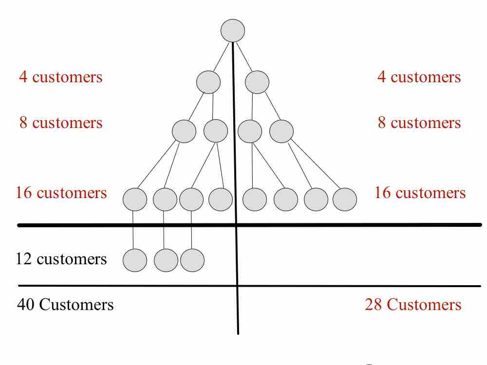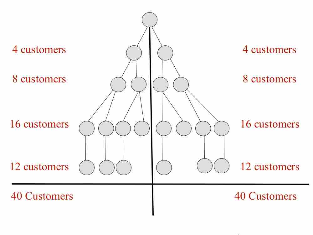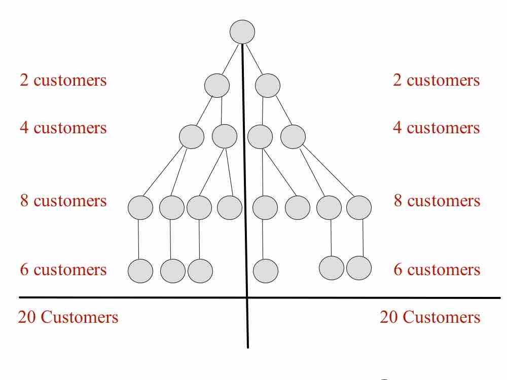So on your right leg if you have 10 reps that have two customers each (20 customers total) that bought a product for $50 that would equal $1000