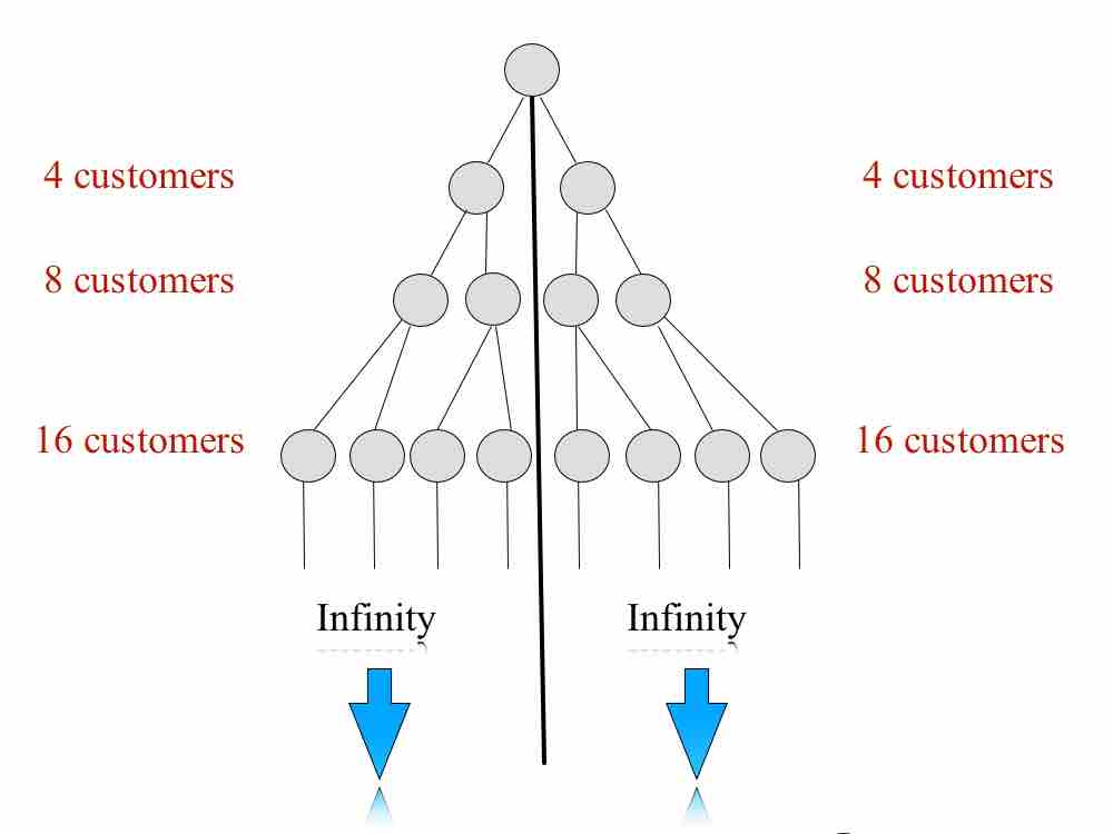 A company may have it set up where if you have 20 customers on your right side and 20 customers on your left side they may pay you the percentage of the volume.